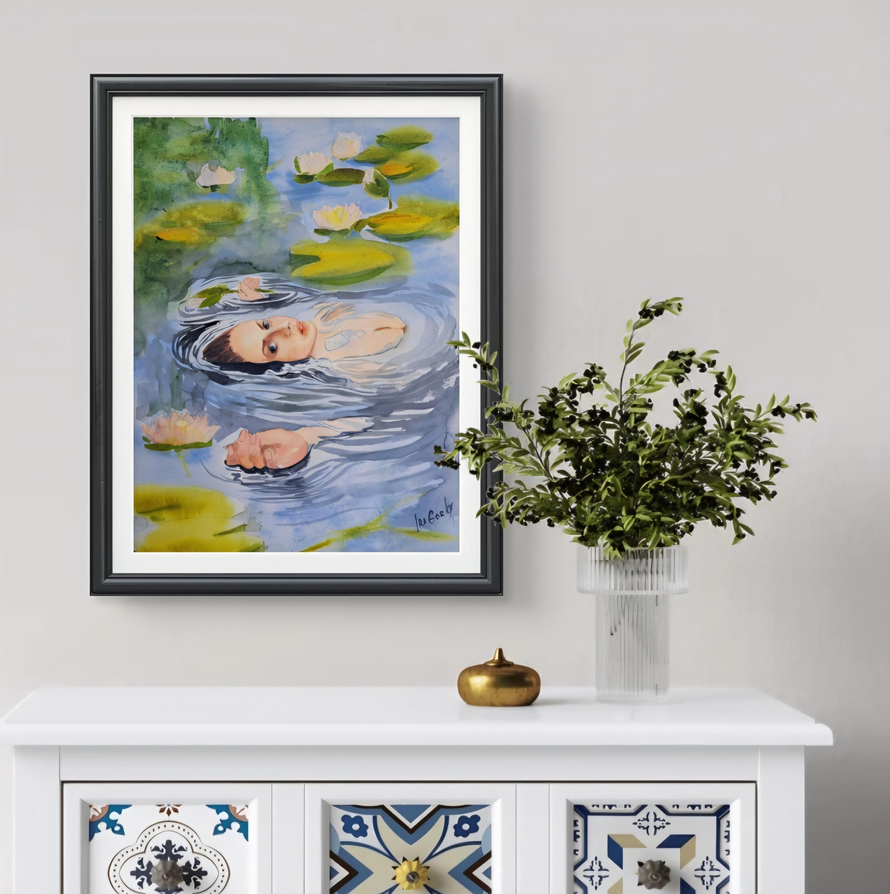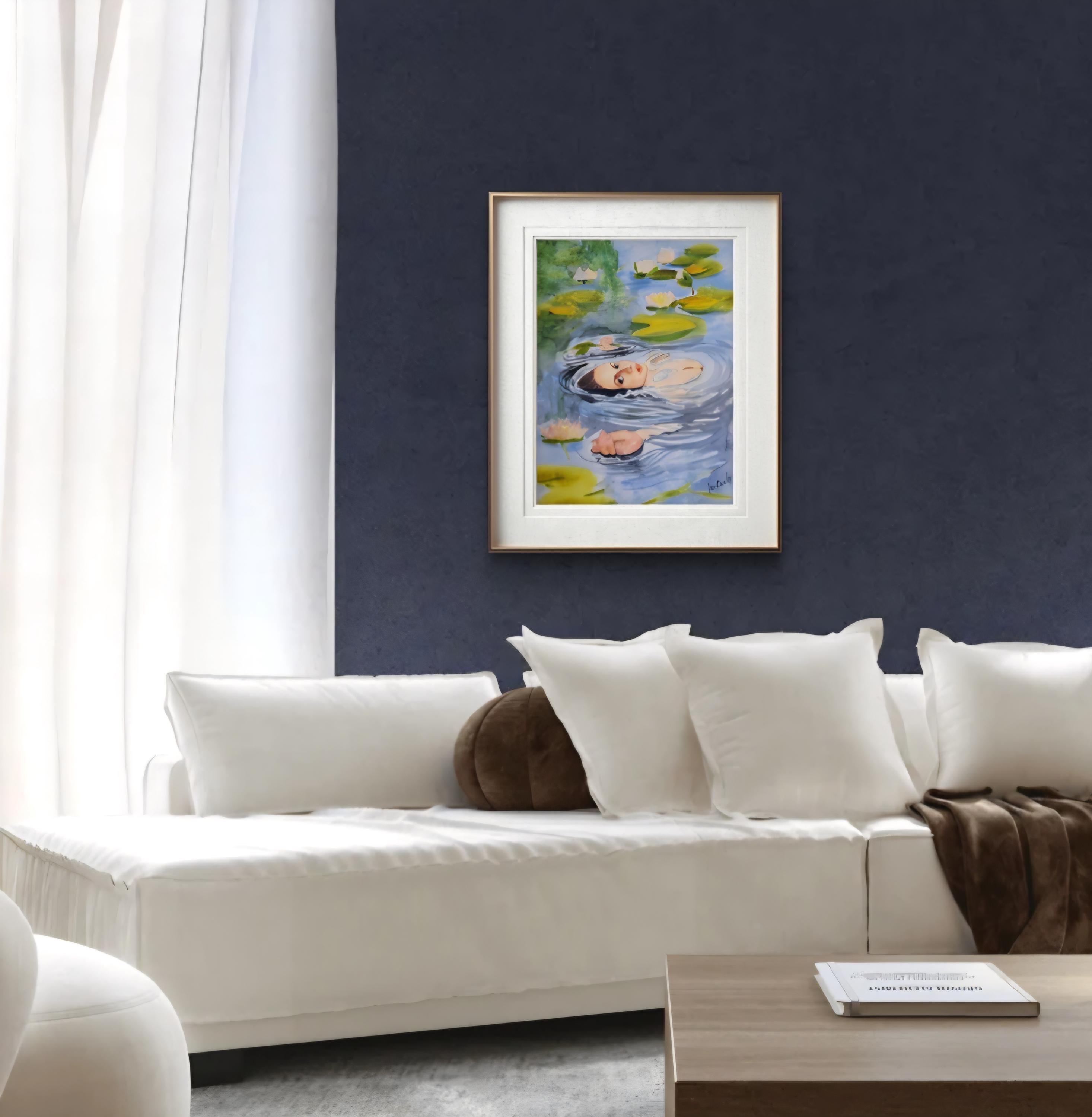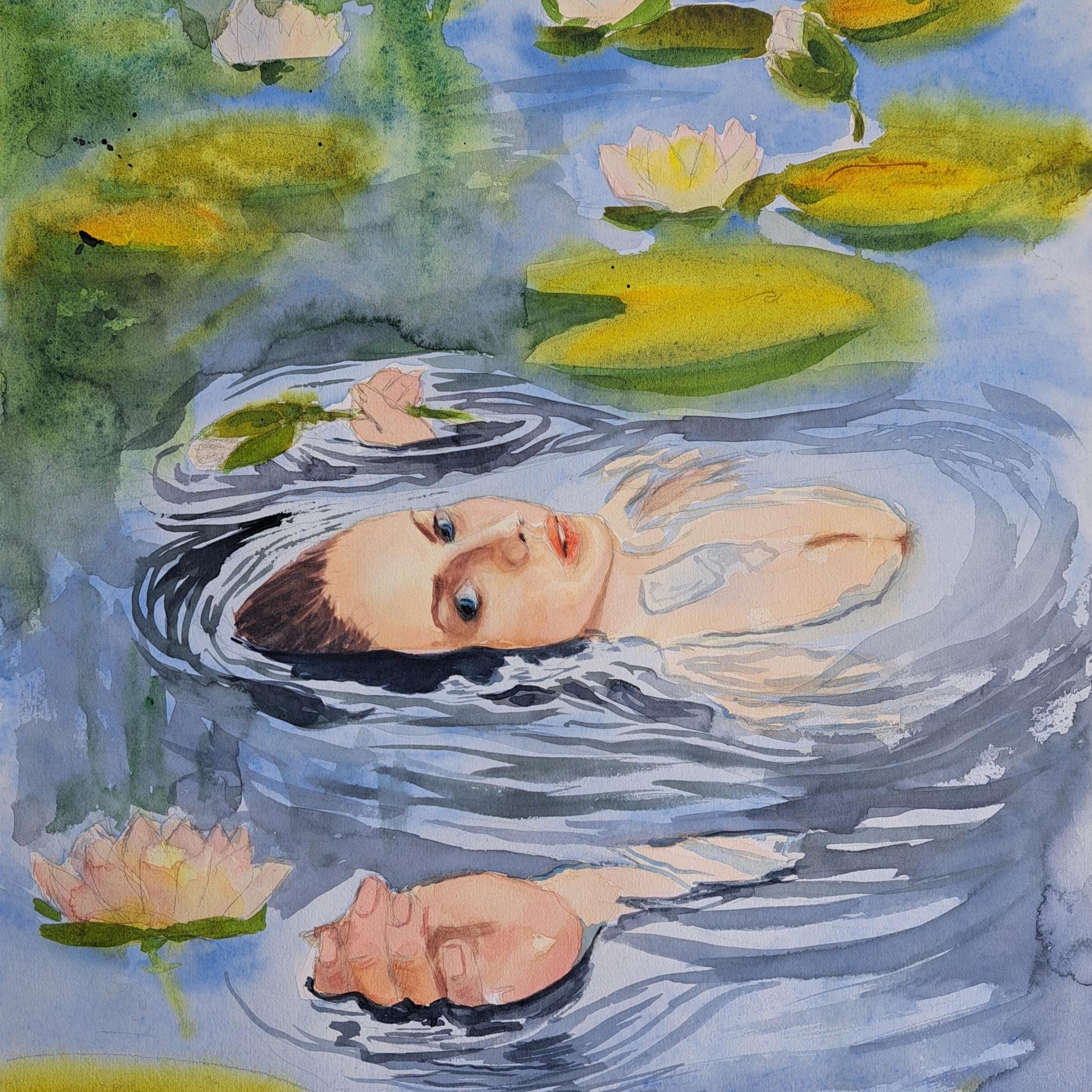 A peaceful watercolor depicting a woman floating among lotus flowers, suspended in the gentle embrace of water. Floating in Stillness explores surrender, calm, and the intimate connection between the human body and nature’s quiet rhythms.