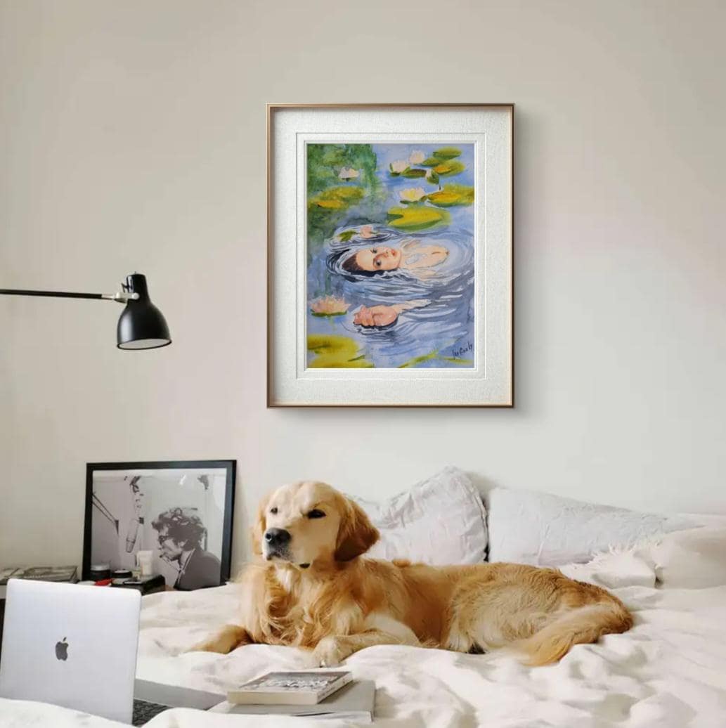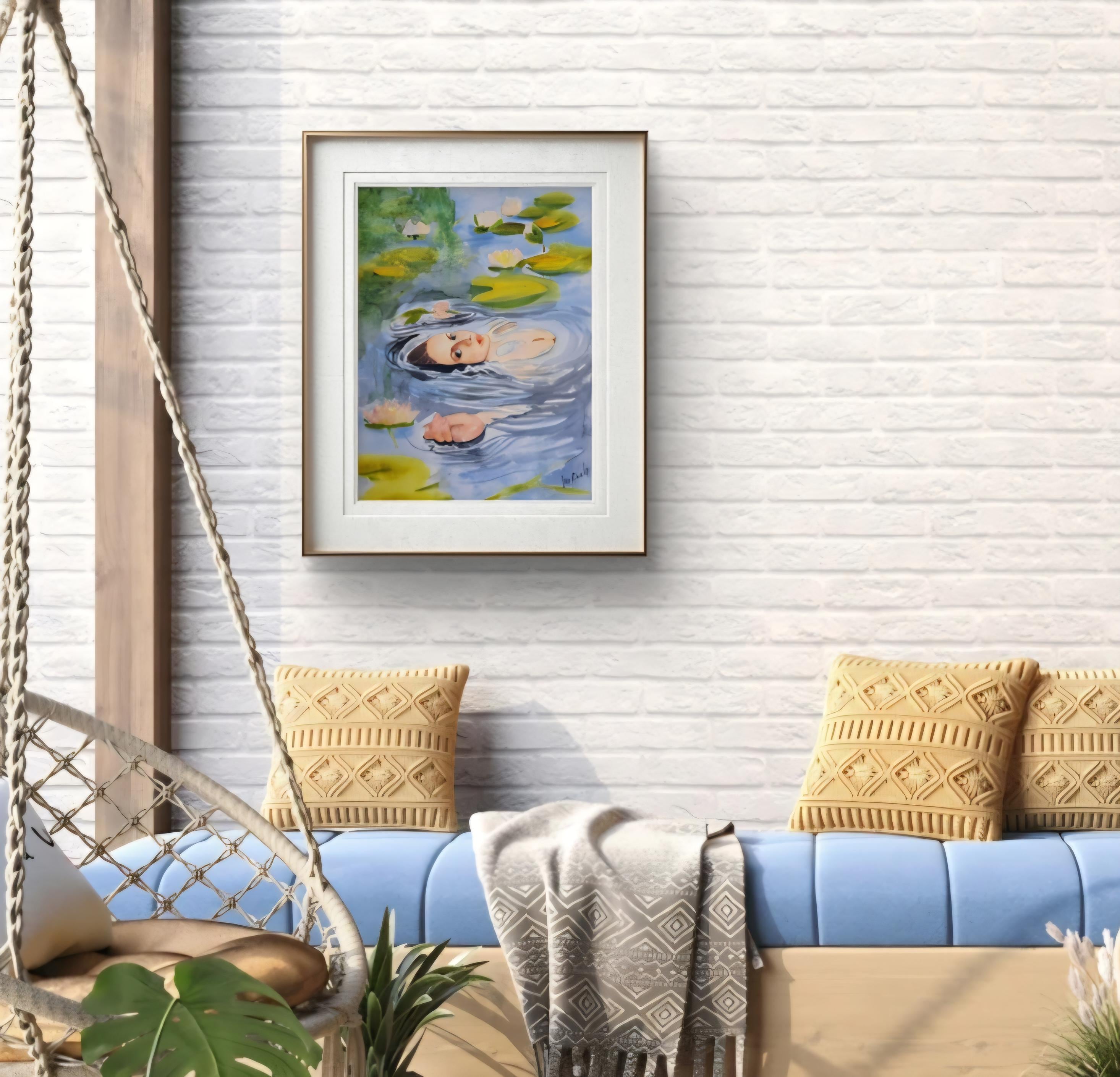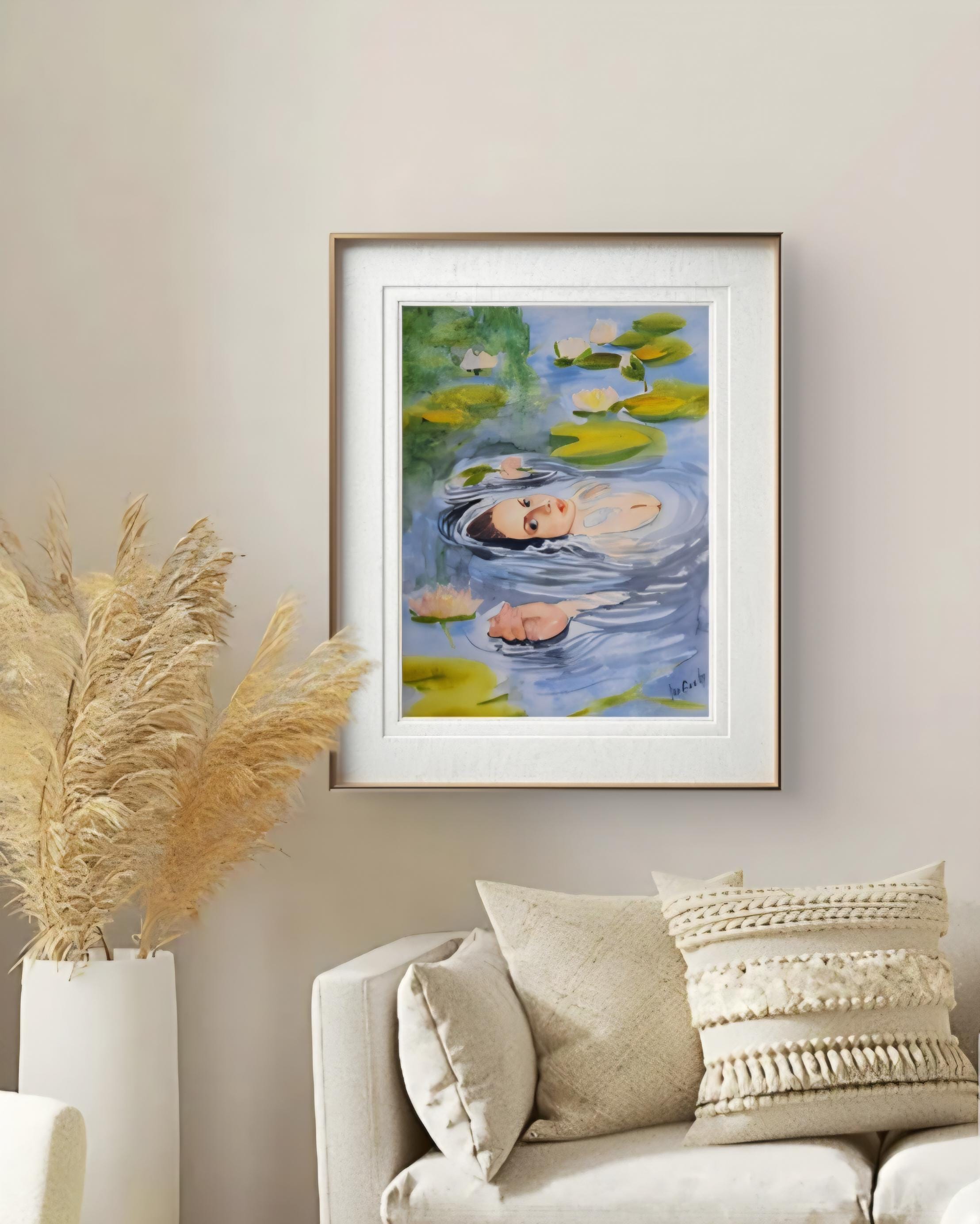 A peaceful watercolor depicting a woman floating among lotus flowers, suspended in the gentle embrace of water. Floating in Stillness explores surrender, calm, and the intimate connection between the human body and nature’s quiet rhythms.