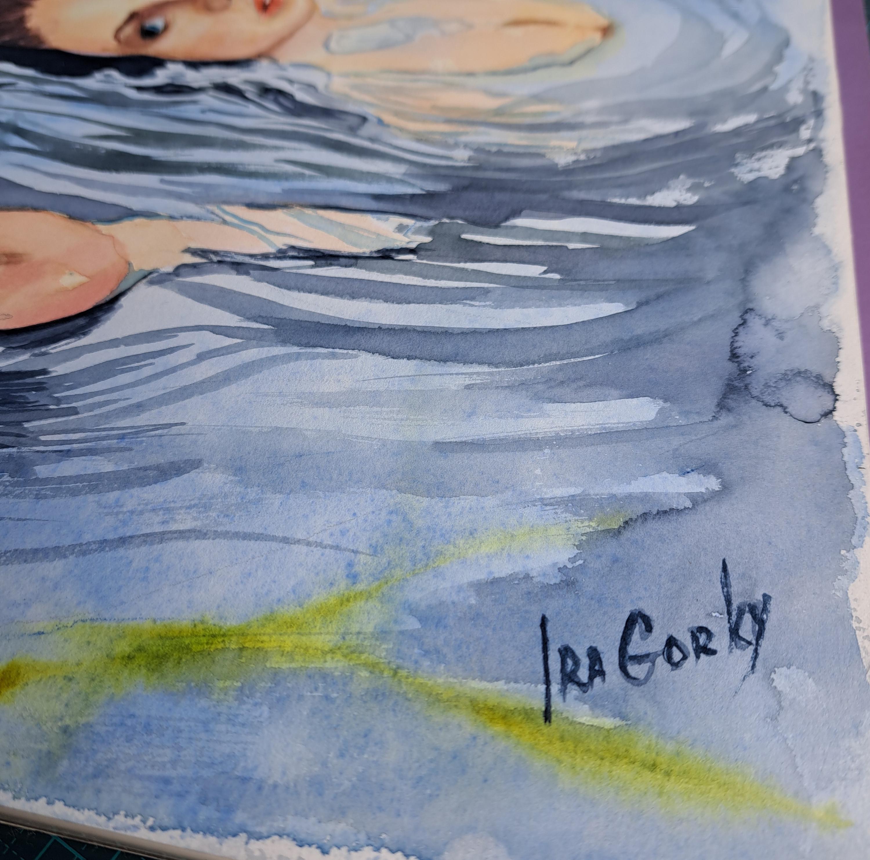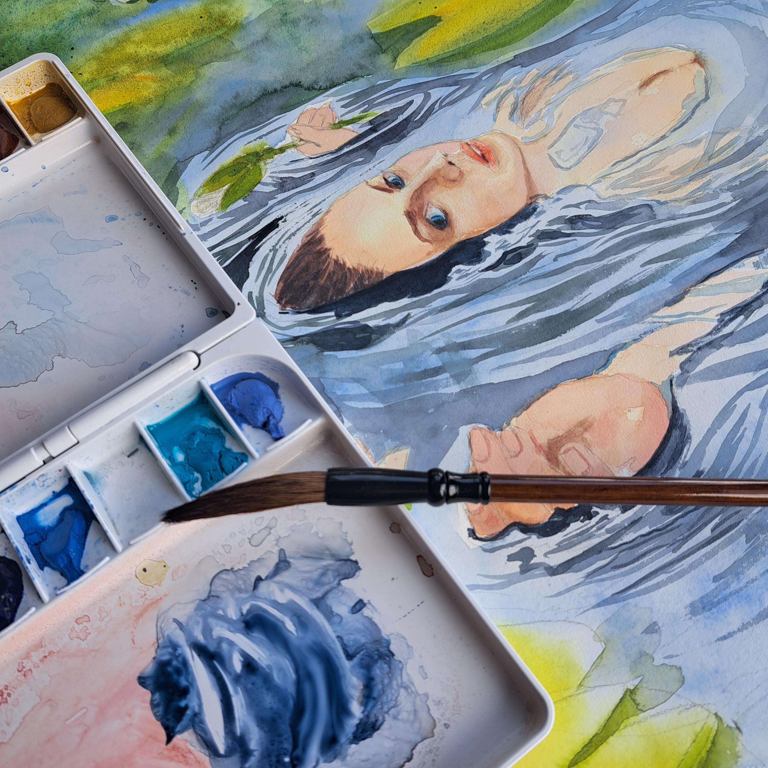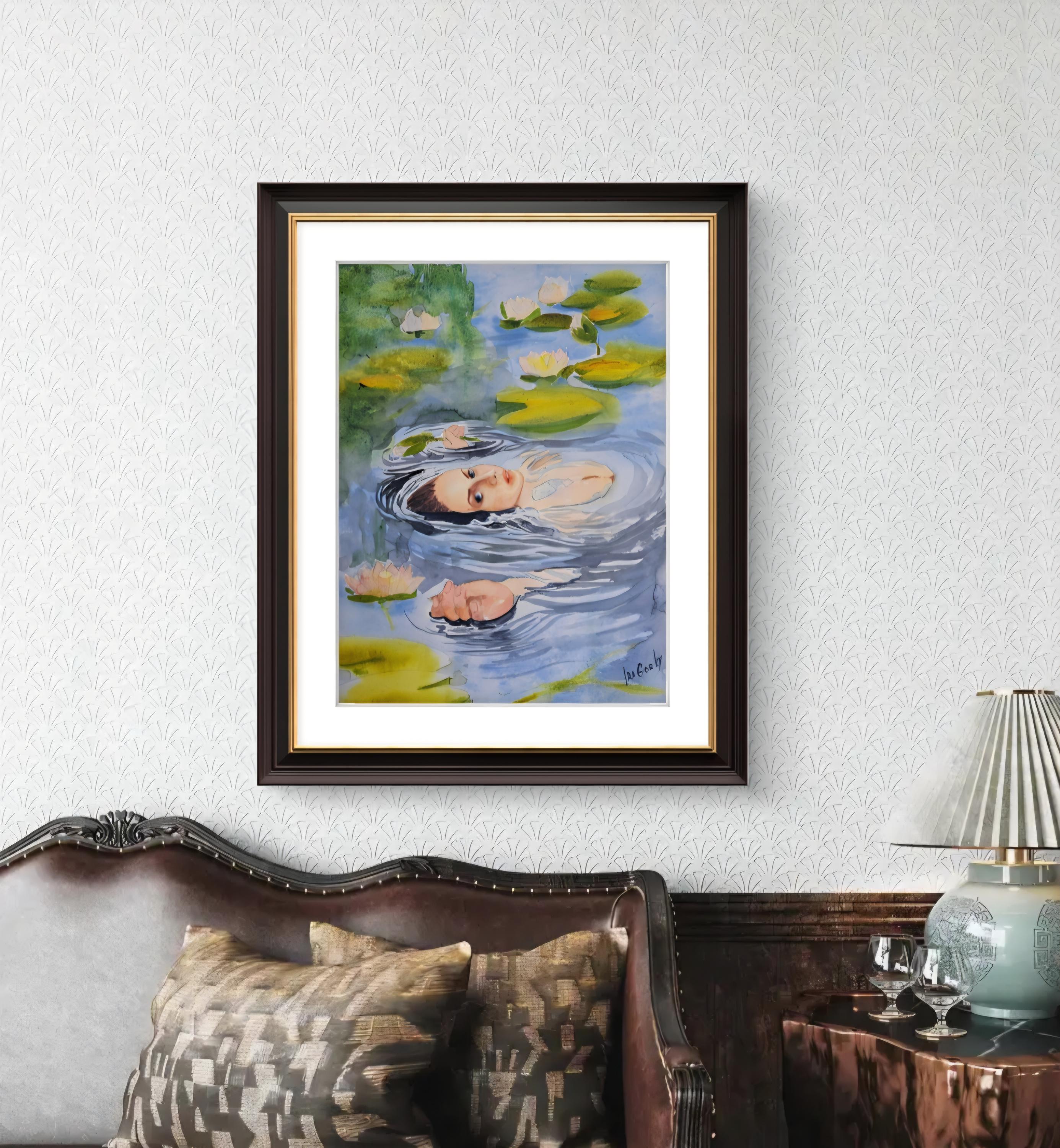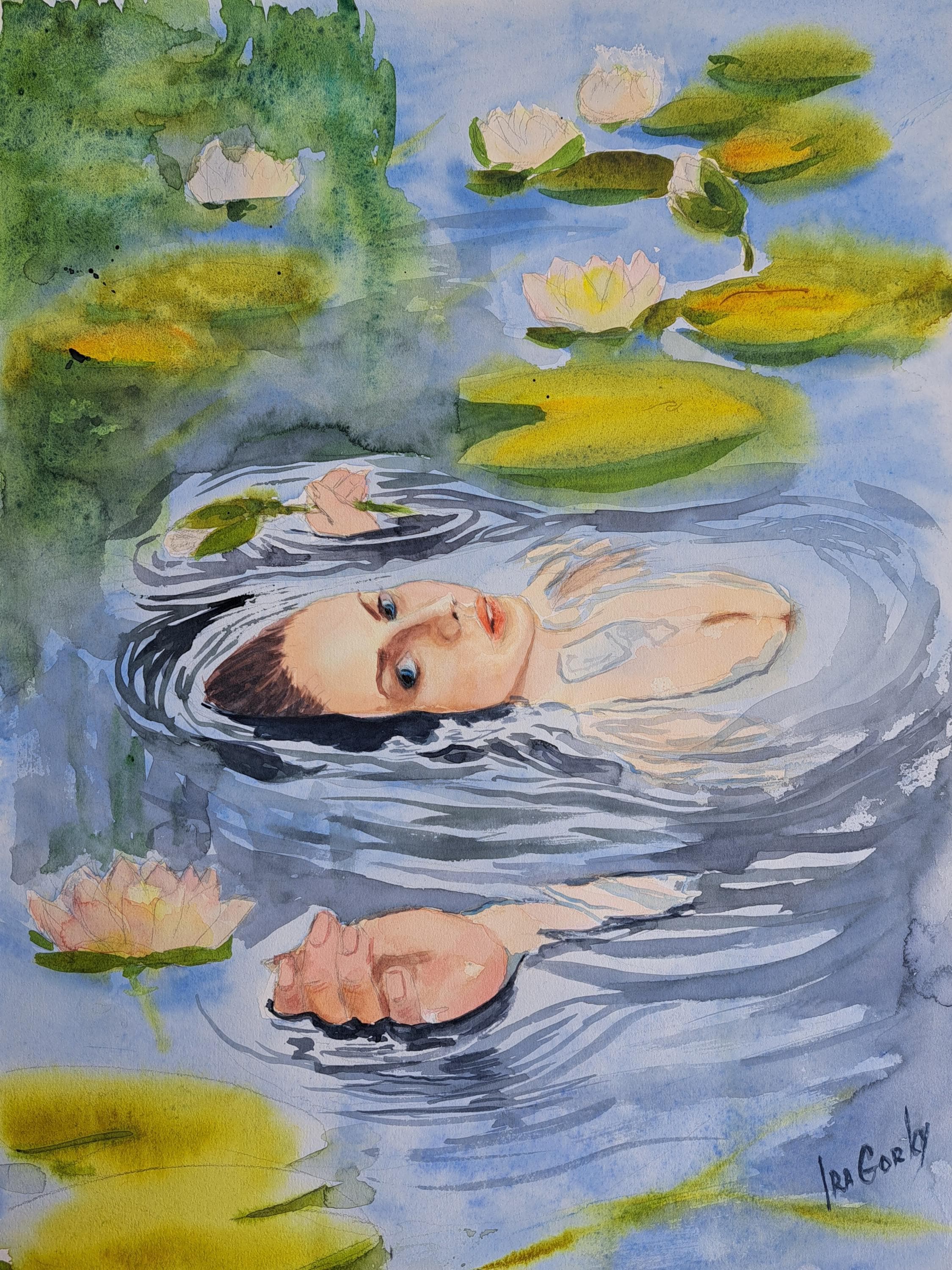 Floating in Stillness is an original watercolor painting depicting a woman drifting among lotus flowers, exploring calm, vulnerability, and the gentle embrace of water.