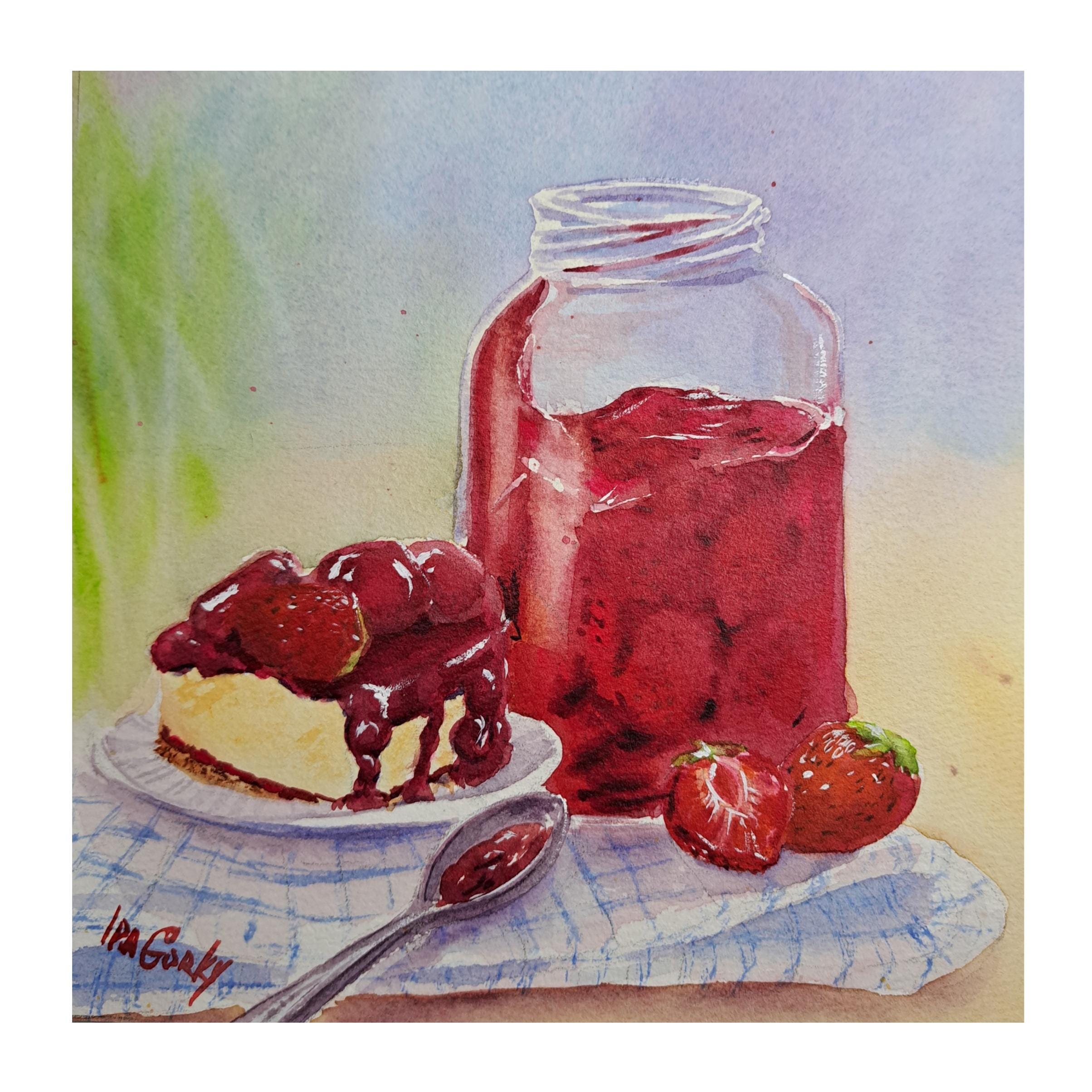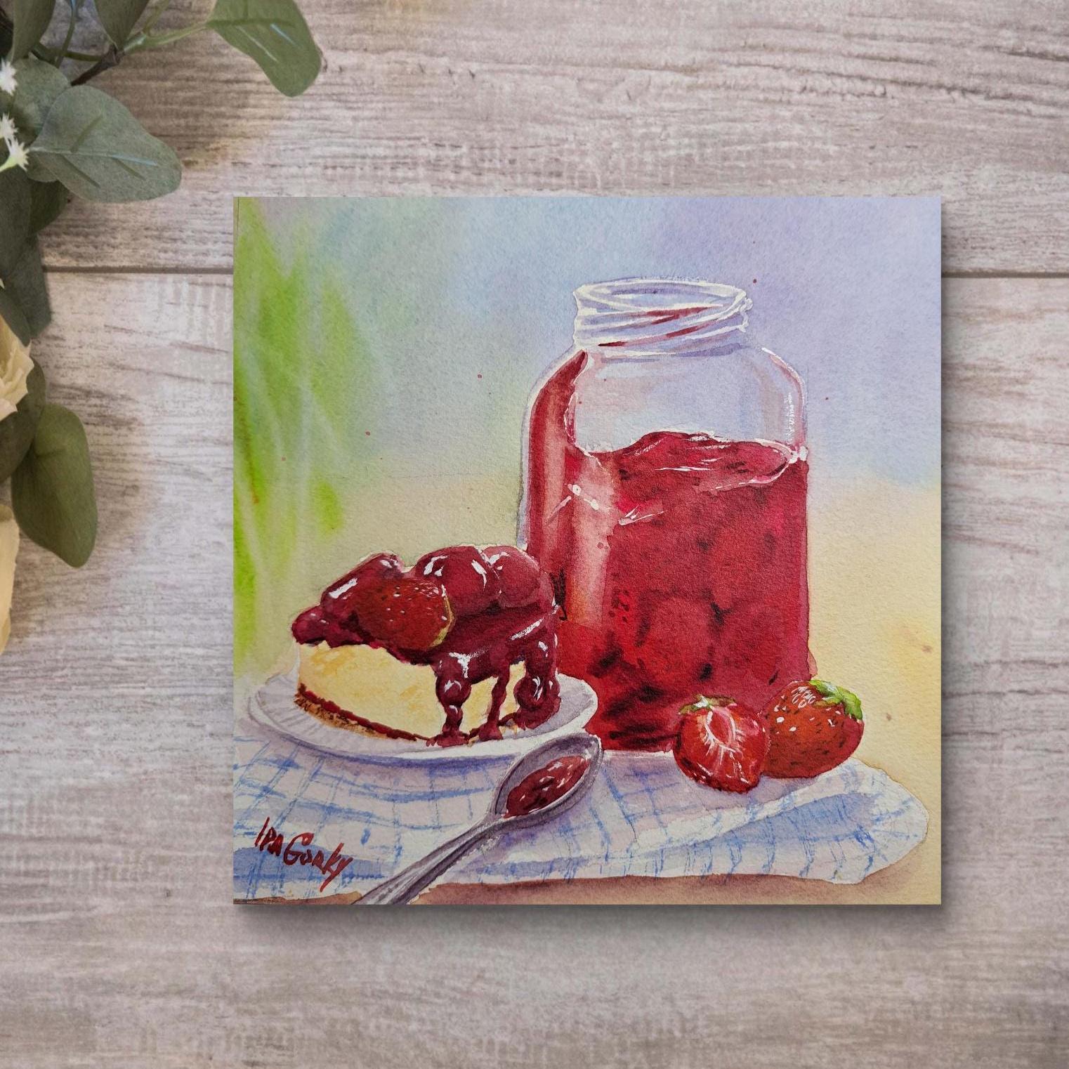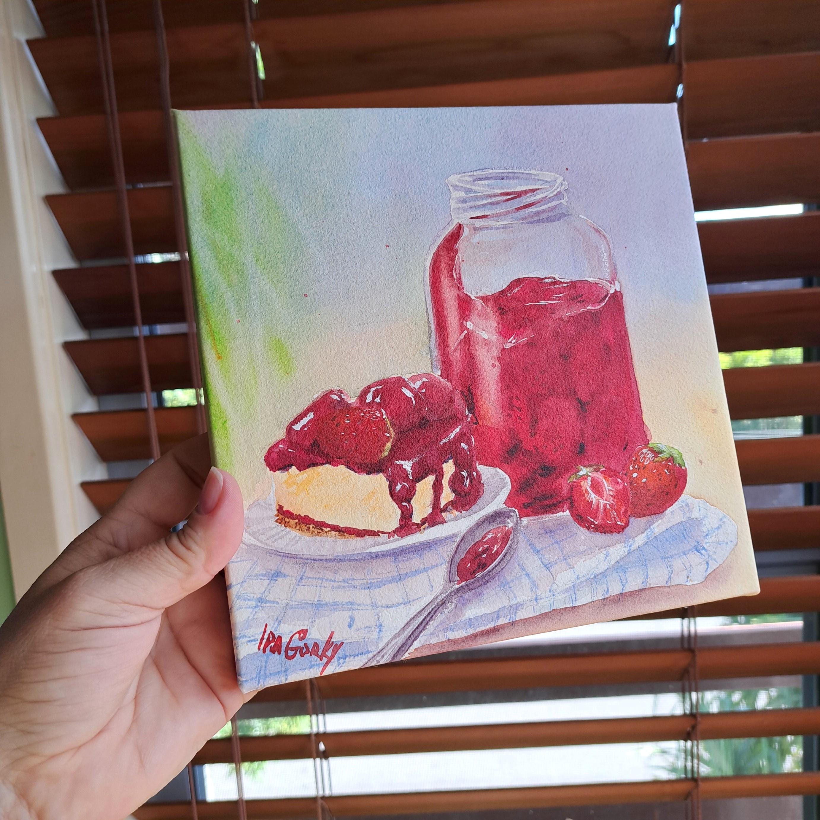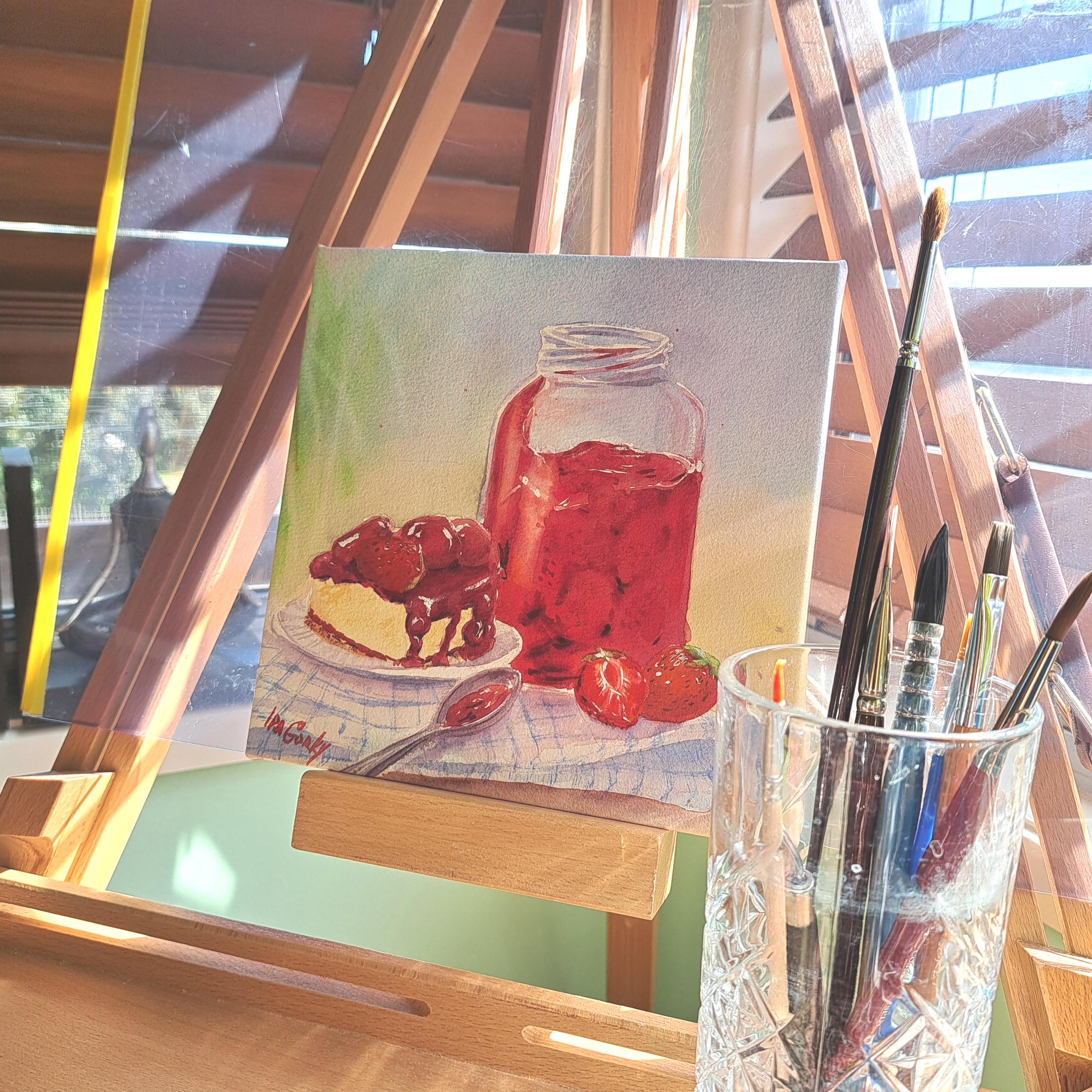 Strawberry jam and Cheesecake painting is that kind of still life original paintings that encapsulates the essence of a hearty breakfast, and brings a sense of comfort and indulgence.