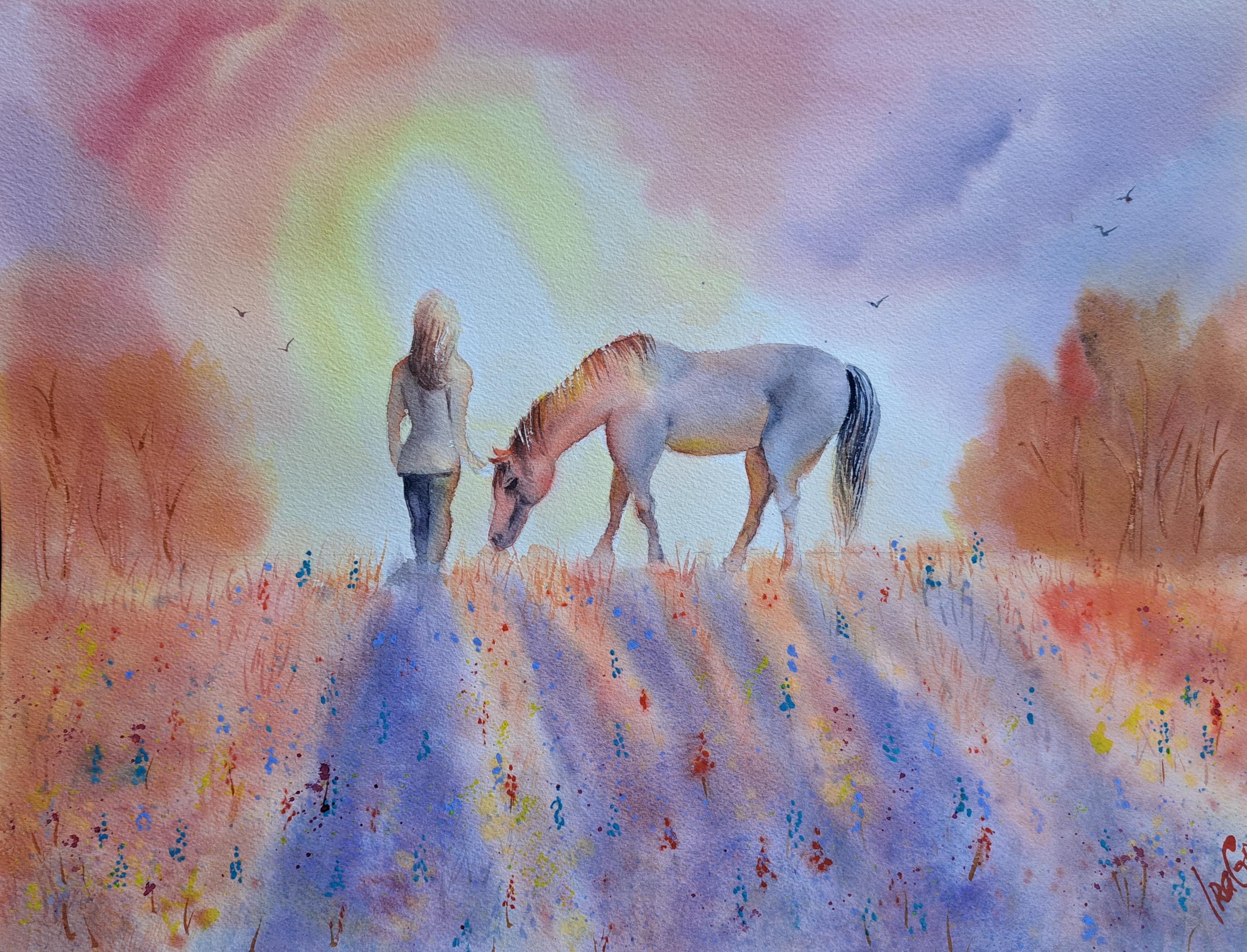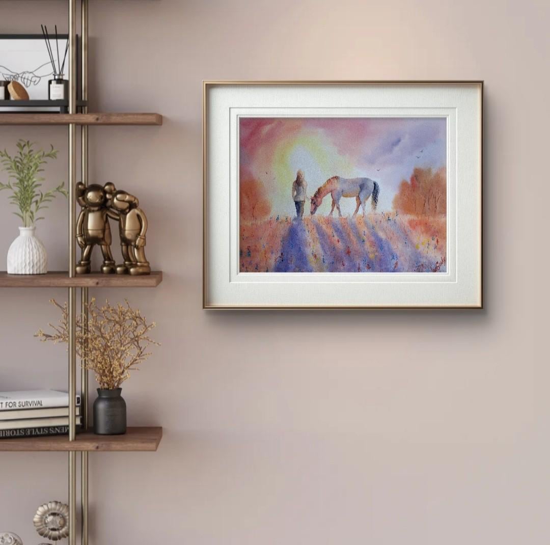 'Quiet Bond' is an original watercolor painting that captures the gentle, wordless connection between a woman and a horse. Inspired by peaceful moments of walking together at sunset, this artwork reflects trust, calm companionship, and the quiet beauty of shared presence.