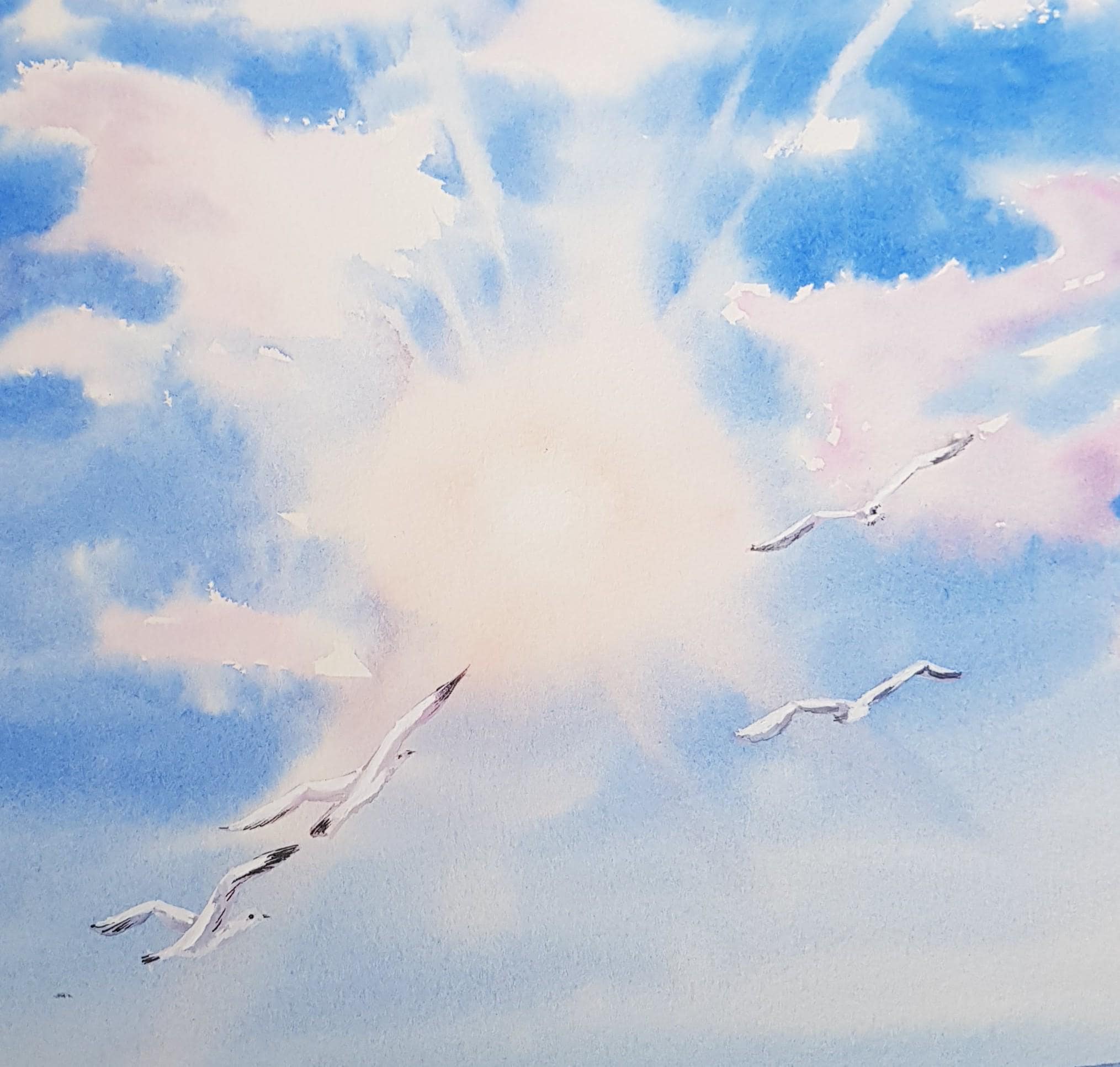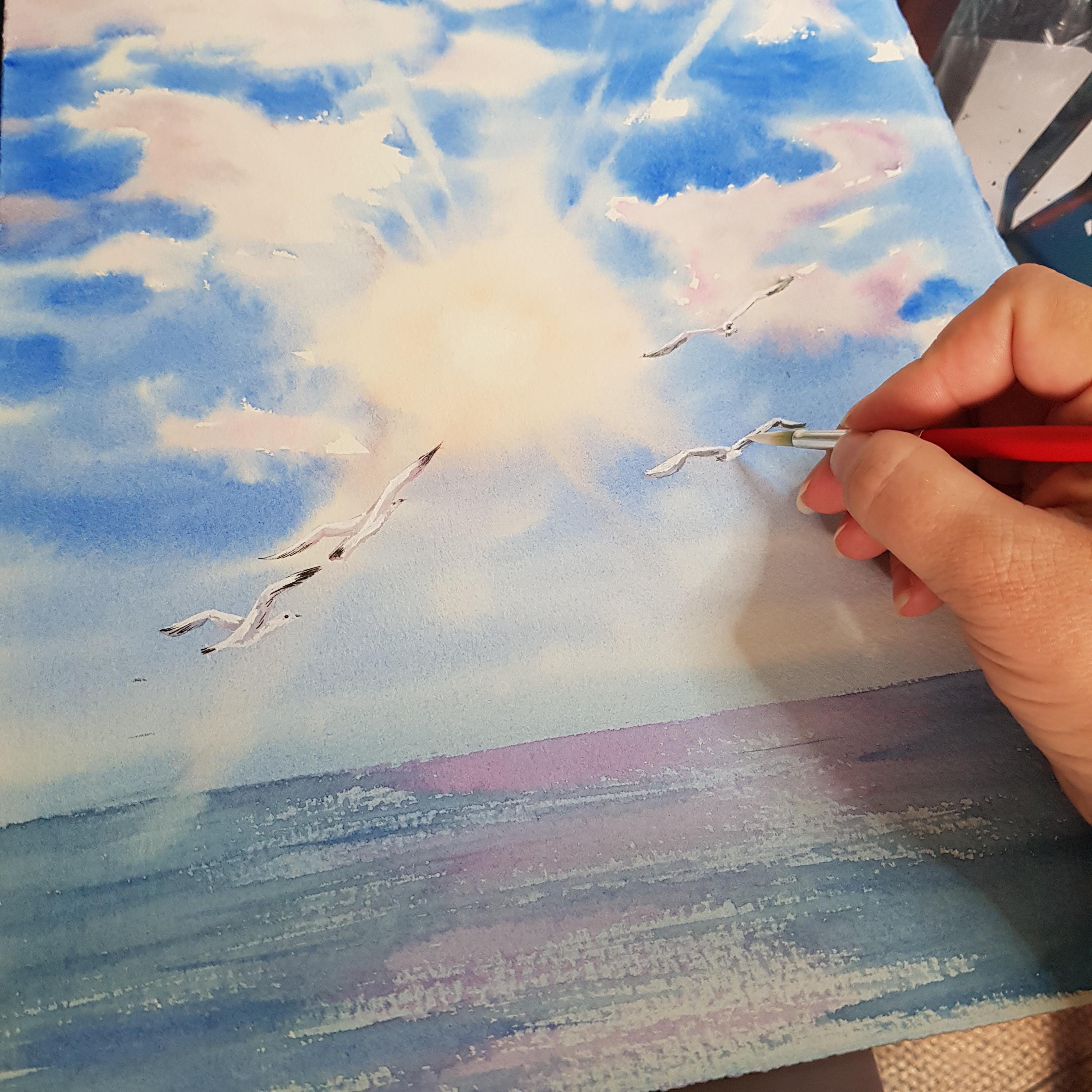 Between Sea and Sky is an original watercolor seascape painting inspired by a quiet coastal moment where ocean and sky meet in calm harmony. Soft blue light fills the sky as seagulls glide gently above the sea, creating a sense of openness and peace.